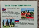 I went on a wine tour which turned out to be more of a sightseeing tour, cost 60 lari. There was 6 of us in a mini van and we travelled as far as Sighnaghi starting at 1025 and returning to Tblisi at 2130, a distance of 280 km. It was supposed to be an English tour but the driver only spoke 3 words of English.