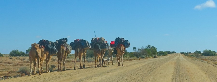 1 dog, 2 humans, 6 camels
